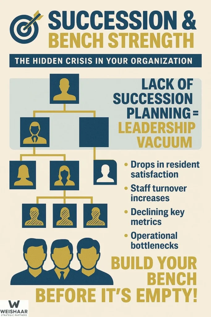 This reactive approach comes with a heavy price tag. Industry research suggests that each key leadership transition costs three to six months of disrupted operations. In practical terms, that means a quarter to half a year of missed opportunities, delayed initiatives, and weakened resident experience.