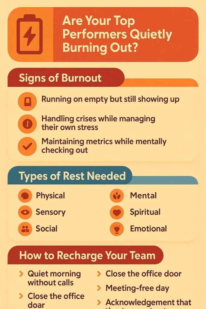 Proactive leaders spot the warning signs, name the seven types of rest, and create systems that keep the energy flowing. The return on this investment shows up in every KPI that matters.