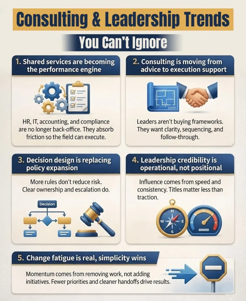 Across consulting engagements, executive teams, and shared services organizations, the same themes are emerging in companies that are sustaining performance while reducing friction.